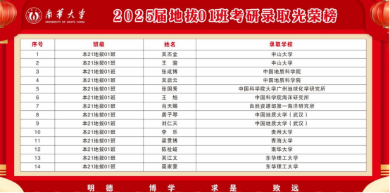 近日,金沙集团1862cc成色2025届本科毕业生升学数据公布,138人成功考研升学,升学率为24.95%,其中,2021级地质学拔尖班(本21地拔01班)表现尤为突出。该班18名学生中,14人成功升学,班级整体升学率达77.8%,创下学院班级升学率新高。其中,4人通过保研进入中国科学院、中国地质科学院等国内高等学府;10人考研成功,录取院校包括中国科学院、中国地质科学院、自然资源部直属科研所等顶尖科研机构,以及中山大学、中国地质大学等“双一流”高校。