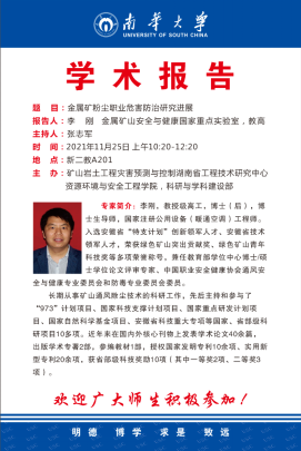 11月25日下午,中钢集团马鞍山矿山研究总院金属矿山安全与健康国家重点实验室李刚教授级高工应邀为我院师生进行了“金属矿粉尘职业危害防治研究进展”学术讲座,讲座由张志军院长主持。