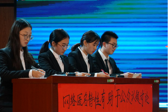 而第二场冠亚军之战的辩题为正方——“网络匿名有助于公众议题讨论”和反方——“网络匿名有害于公众议题讨论”。在本场精彩绝伦的辩论赛上,反方辩手卢书密同学面对正方的多层次提问,不仅沉着地解决所有提问,还巧妙地“借力打力”。而回击反方辩友的正方三、四辩手蒋清丽同学、毕婧同学发言时流利且洪亮,丝毫不拖泥带水,在提问小结这一环节的发言后,可剩整整21秒。最后,正方略胜一筹夺得冠军。反方憾负,获得亚军。