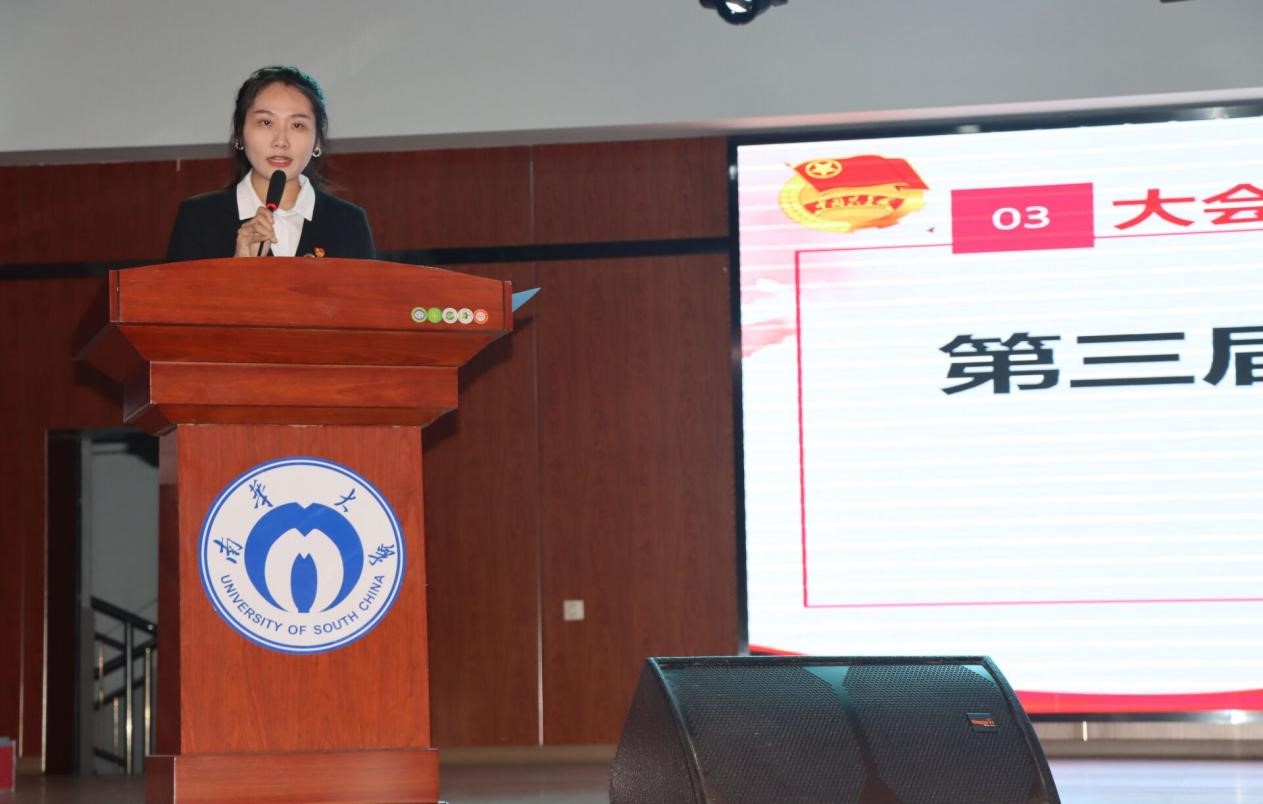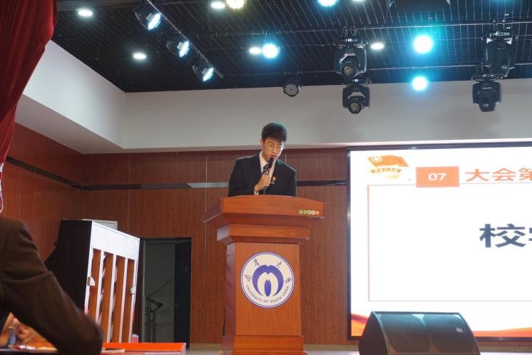 第三届学生会主席戴浩橦同学从“工作的回顾与总结”、“对新一届学生会的工作展望”两个部分向大家做出第三届学生会的工作总结报告。首先介绍了上一年度学风、寝风、学生权益维护和心理健康等五个方面的发展成果,并且对于在校运会中取得的诸多好成绩表示肯定。其次表达了对新一届学生会在工作方面的展望:不忘初心,牢记使命;身体力行,贯彻落实,深化改革;塑造形象,建设自身,乘风破浪。